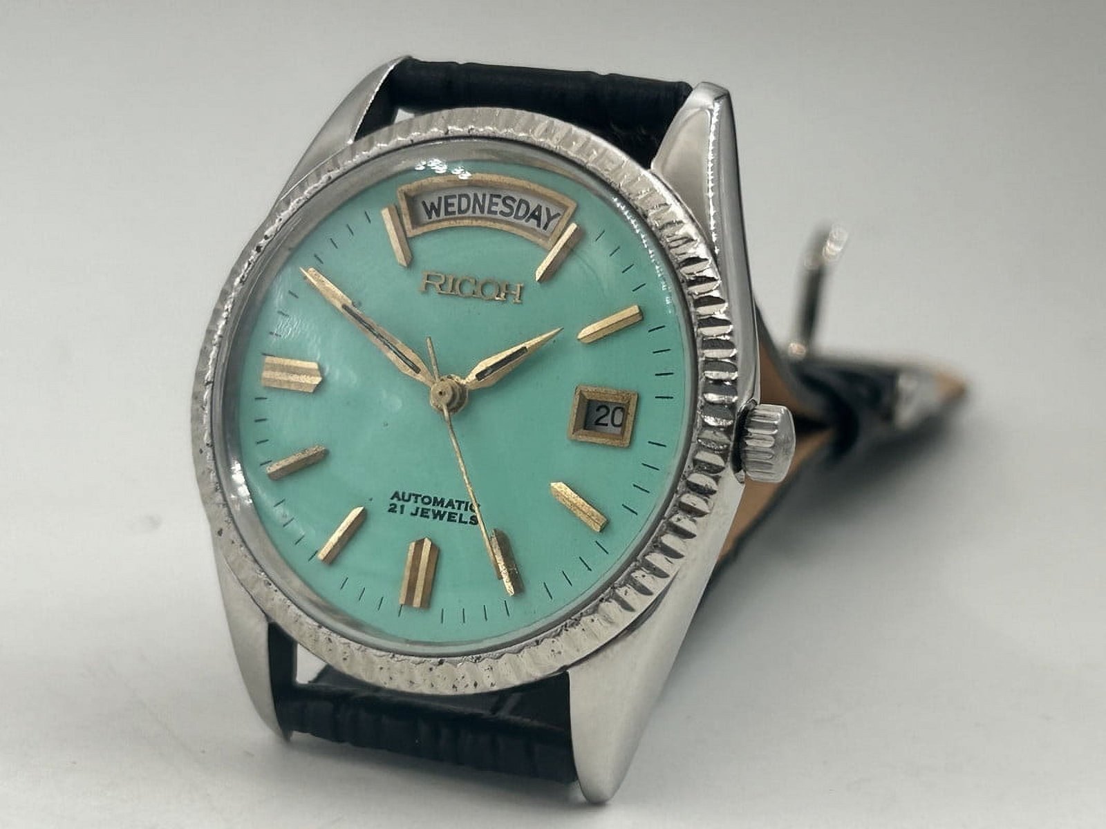 Vintage Ricoh Men?s Automatic Watch ? 21 Jewels, Day & Date Display, Turquoise Dial, Leather Strap