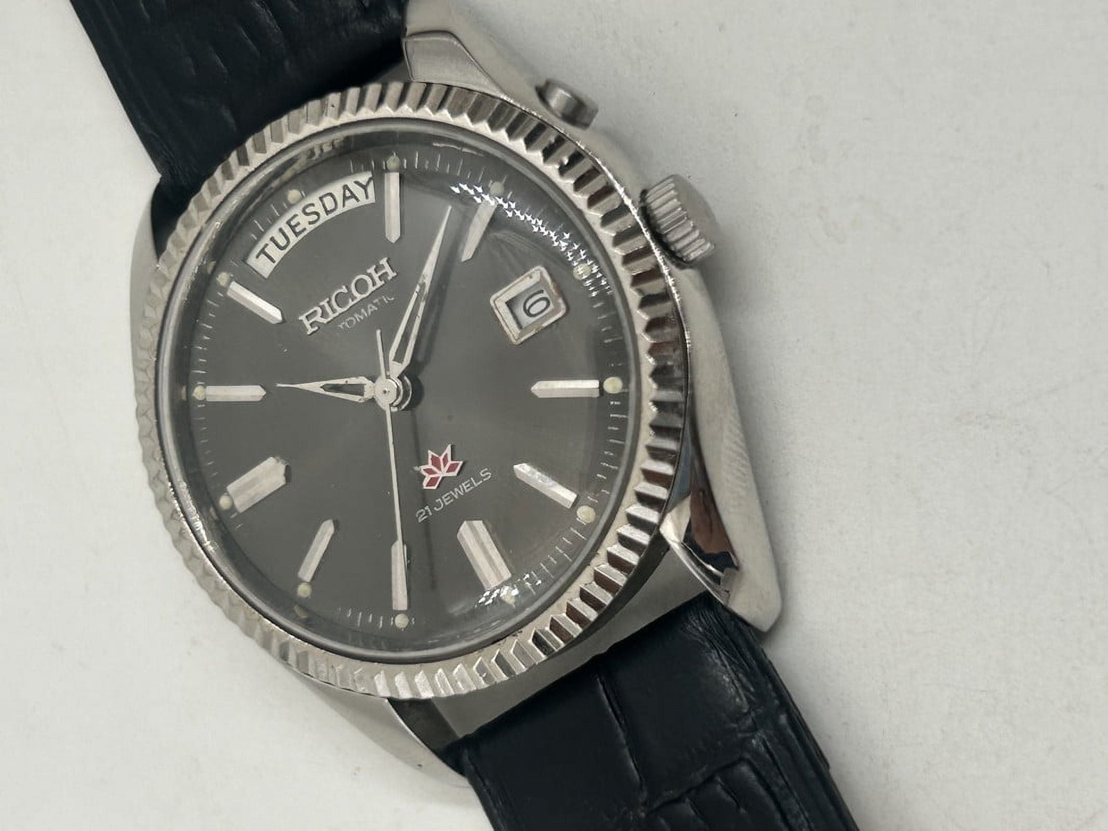 Vintage Ricoh Men?s Automatic Watch ? 21 Jewels, Day & Date, Light Green Dial, Leather Strap